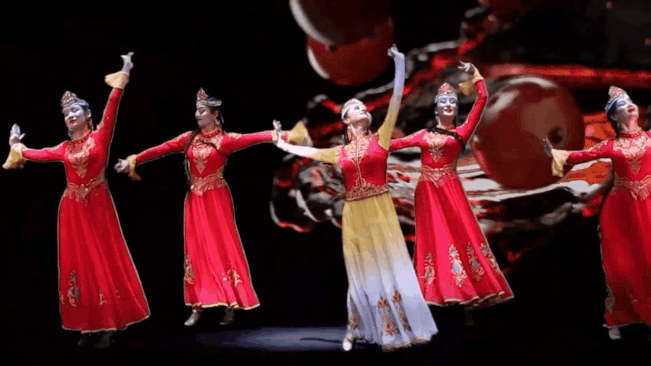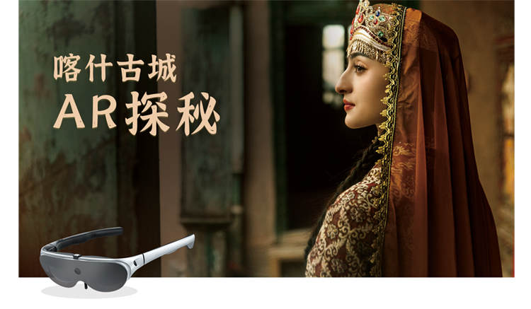 在这个“游戏”中,你是一个骑着骆驼活跃于古丝绸之路的商人,现正站在喀什古城城门之下。戴上AR眼镜,耳边突然传来手鼓和冬不拉乐声,随即眼前浮现出大红城门,徐徐打开,身着维吾尔族服饰的古城主前来相迎: