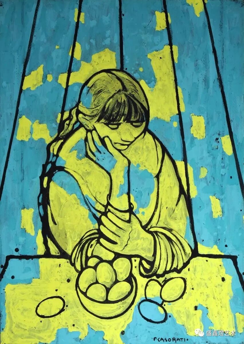 笼罩着女人的环境,一切都遵循着真实,一丝不苟,却又真实到疏离。在卡索拉蒂的绘画中反复出现的是鸡蛋的静物主题,具有完美的形状和脆弱的一致性,这些元素为艺术家提供了一个机会来反思不稳定与形式坚固之间的对比。
