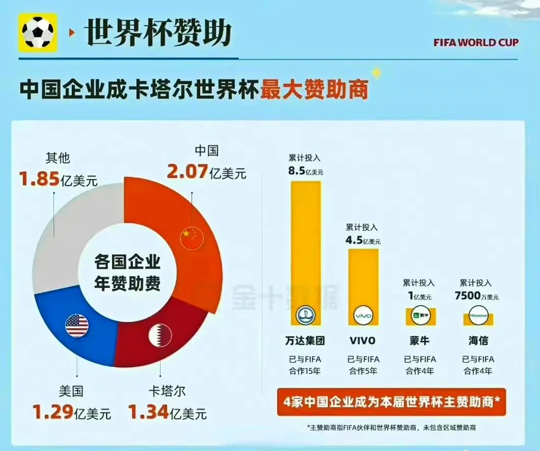 其次,来自中国的赞助商也走进卡塔尔深度参与到了本届世界杯中去。万达集团、海信集团、蒙牛乳业和vivo都是本届卡塔尔世界杯官方赞助商。其中,万达集团是国际足联合作伙伴,其余3家是世界杯官方赞助商。