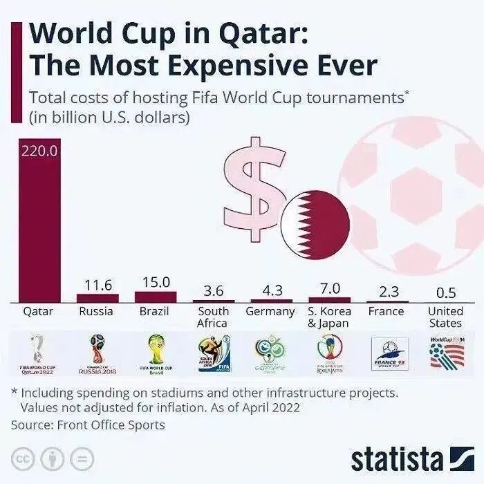因此,这也是此次世界杯成了史上最壕无人性的一届,据相关数据统计,卡塔尔世界杯的举办成本超过了往届所有世界杯的成本总和。