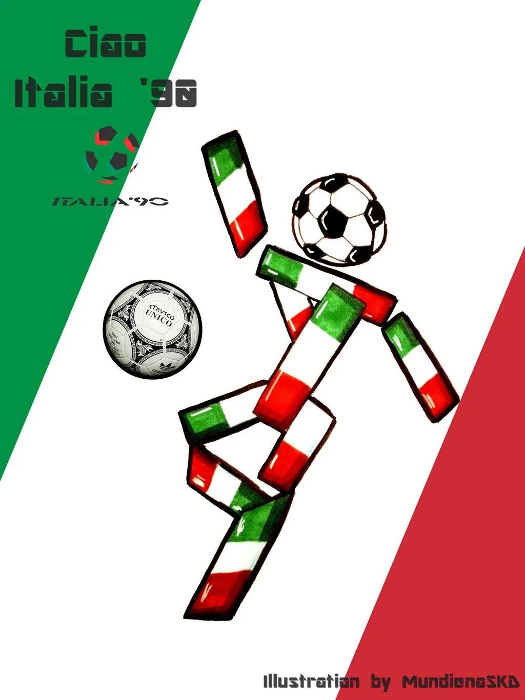 1990年,意大利世界杯吉祥物“查奥”则显得比较抽象,它是一个以绿、白、红三色(意大利国旗色)积木和足球组成的人偶。