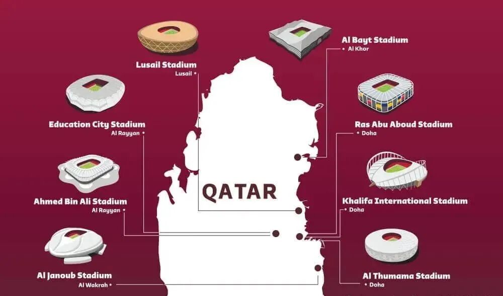 卡塔尔准备了8座球场用于世界杯的比赛,分别是:卢塞尔球场、海湾球场、教育城球场、艾哈迈德·本·阿里球场、哈里法国际体育场、阿图玛玛球场、974球场、贾努布球场。