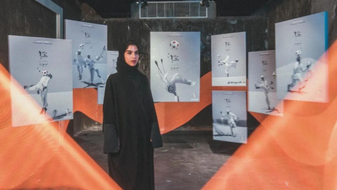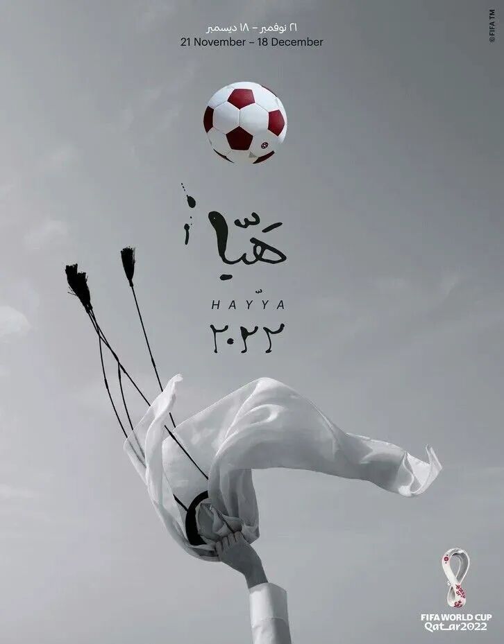 2022年6月15日,卡塔尔世界杯足球赛主办方公布了本届世界杯的官方海报,设计来自卡塔尔女性画家博泰娜(Bouthayna Al Muftah)。海报将卡塔尔传统头饰、服装与足球运动相结合,背景是十分具有代表性的卡塔尔景观:大海与沙滩。描绘了属于卡塔尔的足球故事,充分表达了卡塔尔及阿拉伯地区对这一盛事的热切期盼。