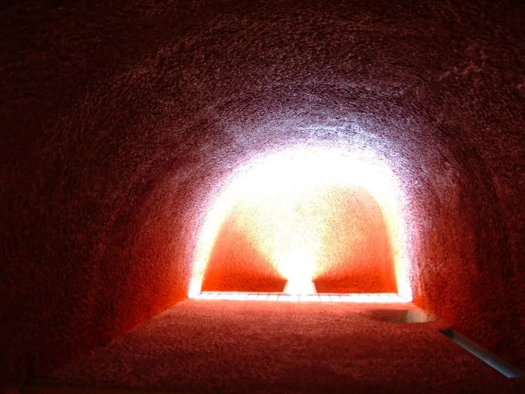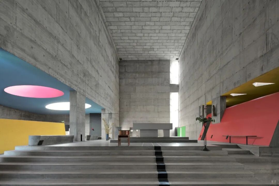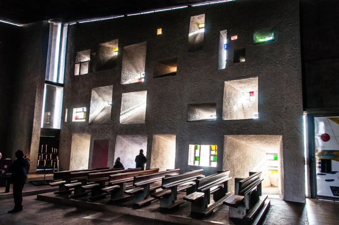 而东南角的锋利边缘线条爽利而陡直,彰显着秩序与精准,而内部空间则是像地下墓穴一般的黑暗房间,精心构思的大小不一的窗户将阳光引入教堂,创造出了超凡之感,仿佛置身于壁龛之中,而壁龛上点缀着星星点点的小孔,让人联想到星空与天体。