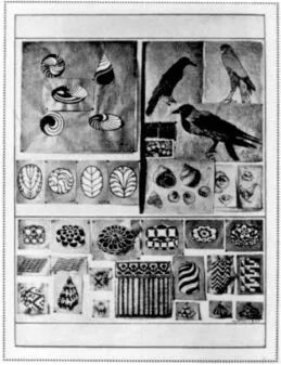 柯布的学生制作的应用图案倾向于将主题材料大幅简化为简单的几何形状,如1912年Nouvelle Section招股说明书的页面底部所示。一些图案实际上否定了它们所装饰的隐含的三维形式,似乎预示着装饰艺术和欧普艺术;但三角形松木和阶梯状岩石图案仍然可以作为其中一些设计的基础,这些设计在水平和垂直方向上重复单元以及避免阴影,达到了失重的效果。