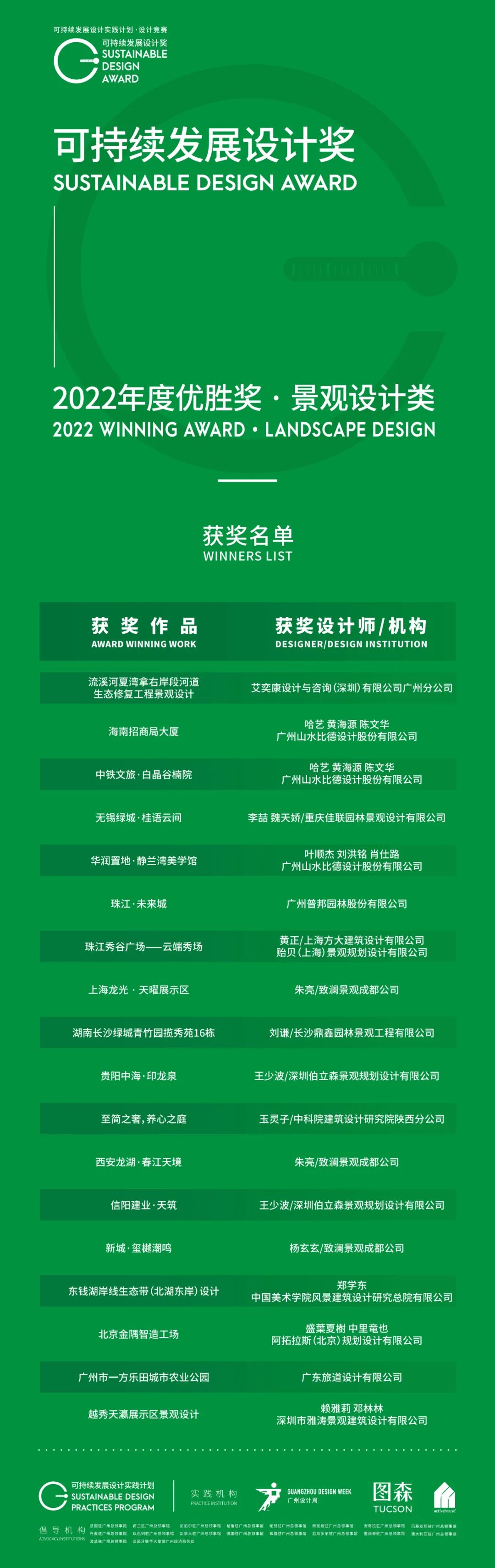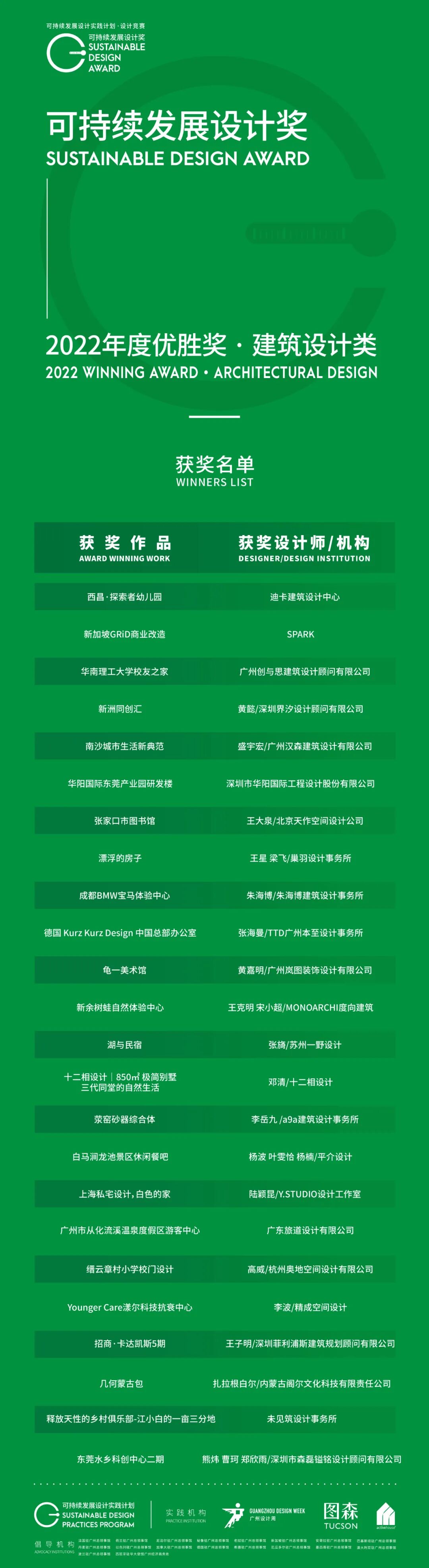 再次祝贺以上荣获“可持续发展设计奖·2022年度优胜奖·建筑设计类/景观设计类/室内设计类”的优秀获奖者们!他们将共同角逐“可持续发展设计奖·2022年度金奖(建筑设计类/景观设计类/室内设计类)”的荣誉,让我们期待揭晓的时刻!