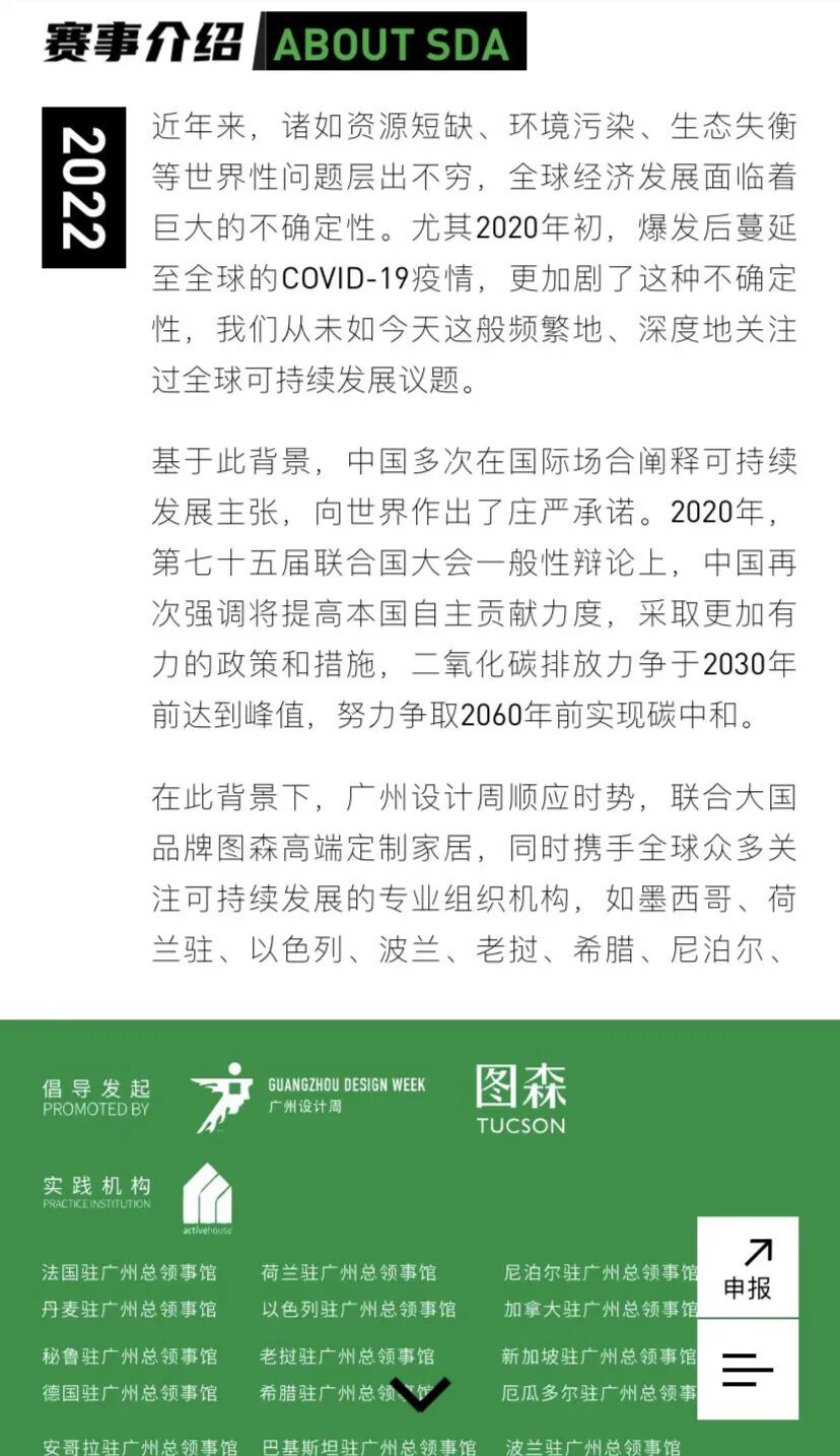 可持续发展设计奖作为“可持续发展设计实践计划”的重要一环,板块介绍内容完整,页面除了温馨的“奖项申报截至倒计时”提示外,还涵盖“赛事介绍、奖项设置、赛事日程”,为参评设计师提供最完整的奖项资讯和时间节点。