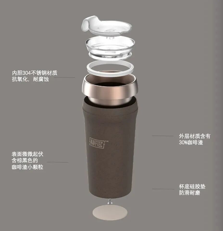 A:其实并不是 100% 咖啡渣的成分,目前现有的技术还不能100% 地用咖啡渣做成性能达到工业标准的商品。我们用咖啡渣取代塑料,降低塑料在设计中的占比,体现的核心设计理念是减塑。我们的核心技术是注塑,将咖啡渣和 PP(聚丙烯)结合形成咖啡渣 PP 粒子的新型材料。当然,我们也在不断探索咖啡渣利用最大化的方法。