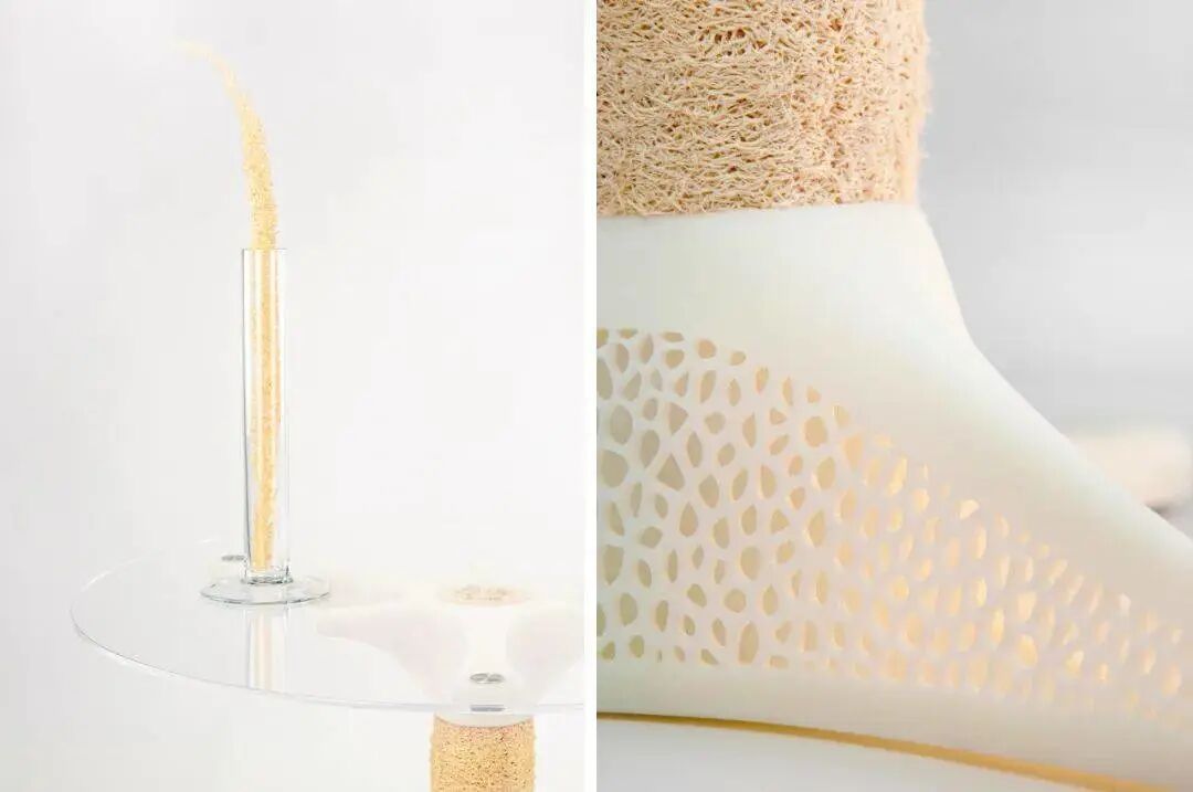于是“研究员”梁晨大量购买植物书籍,四处咨询植物专业的朋友,“我觉得这种跨专业、跨领域的学习,虽然充满了挑战,但也会有很多打破界限的收获。”最终,他们将看上去柔软的丝瓜做了硬化处理,成为一种新的自然材料,在能够承受非常大压力的同时又做到了质量很轻。边桌是利用丝瓜高强硬度的材料属性,将其作为整体的支撑结构。3D打印部分从外部造型到内部结构以及表面的镂空,均是用计算机参数化的算法沿着丝瓜的结构与纹理“生长”而成。