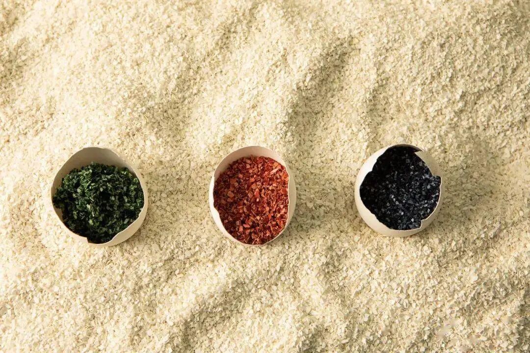 从设计师的角度来说,Elaine创作这个系列时很享受在清洗、挑选、打碎、风干之后,给蛋壳上色的过程,在颜色的选择上,一方面考虑到鸡蛋本身用于烘焙,希望呈现一种与之相关的自然色调,像烤制的蛋糕;另一方面她用植物不同部分提炼出来的红绿蓝来呈现RGB的三种基本色。