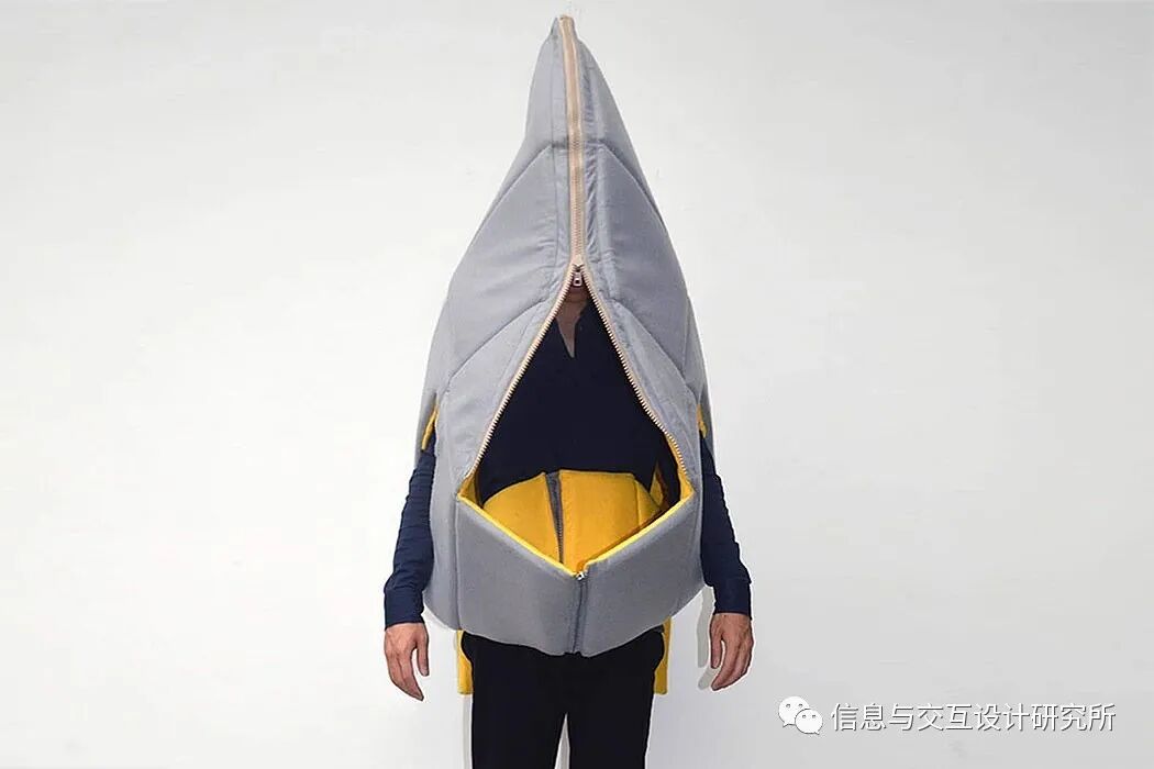 这款“可穿戴式庇护所”采用了高密度聚乙烯合成纸(Tyvek),其轻量又不失强韧,特快专递的信封就用的它。它很难被撕破,允许水蒸气通过,但又可以隔绝液态水。这件衣服的内衬为聚脂薄膜(Mylar),能够隔绝保持身体的热量。