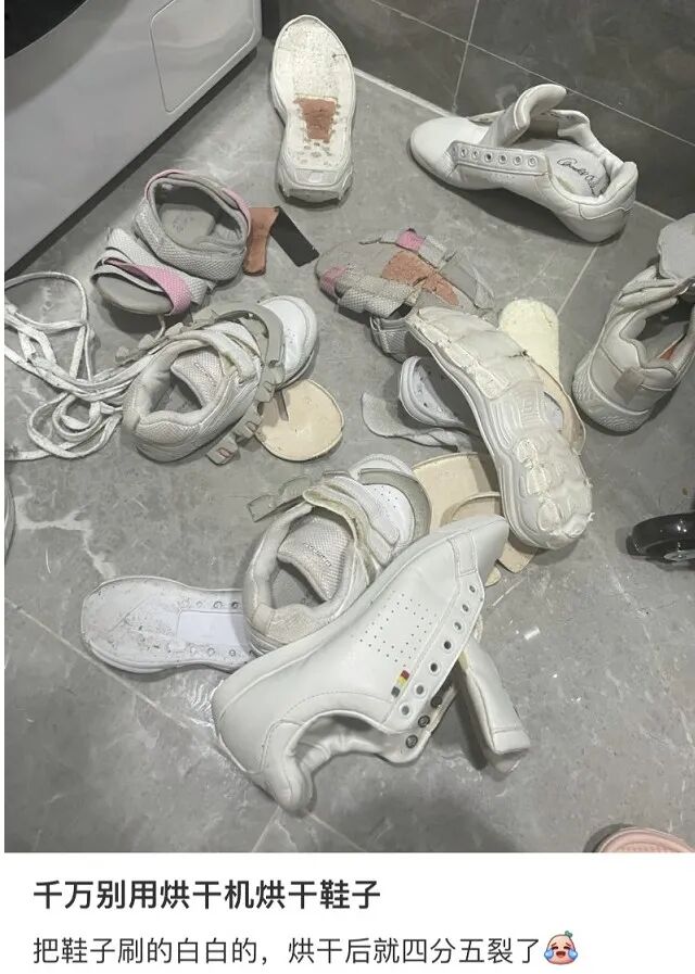 现在很多人家里都有烘干机,洗完鞋直接丢进去烘干,可没想到自己心爱的鞋烘了一下,直接四分五裂,心痛到无法呼吸!