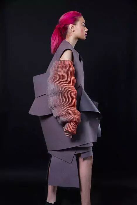 Katie Roberts Wood擅长通过几何多边形的同步运动去打造不需要缝合和接缝的面料,面料的密度、层次、形态、色彩能随人体行为发生变化,并产生奇特的光学效应,并创造出空想和意想不到的纹理。