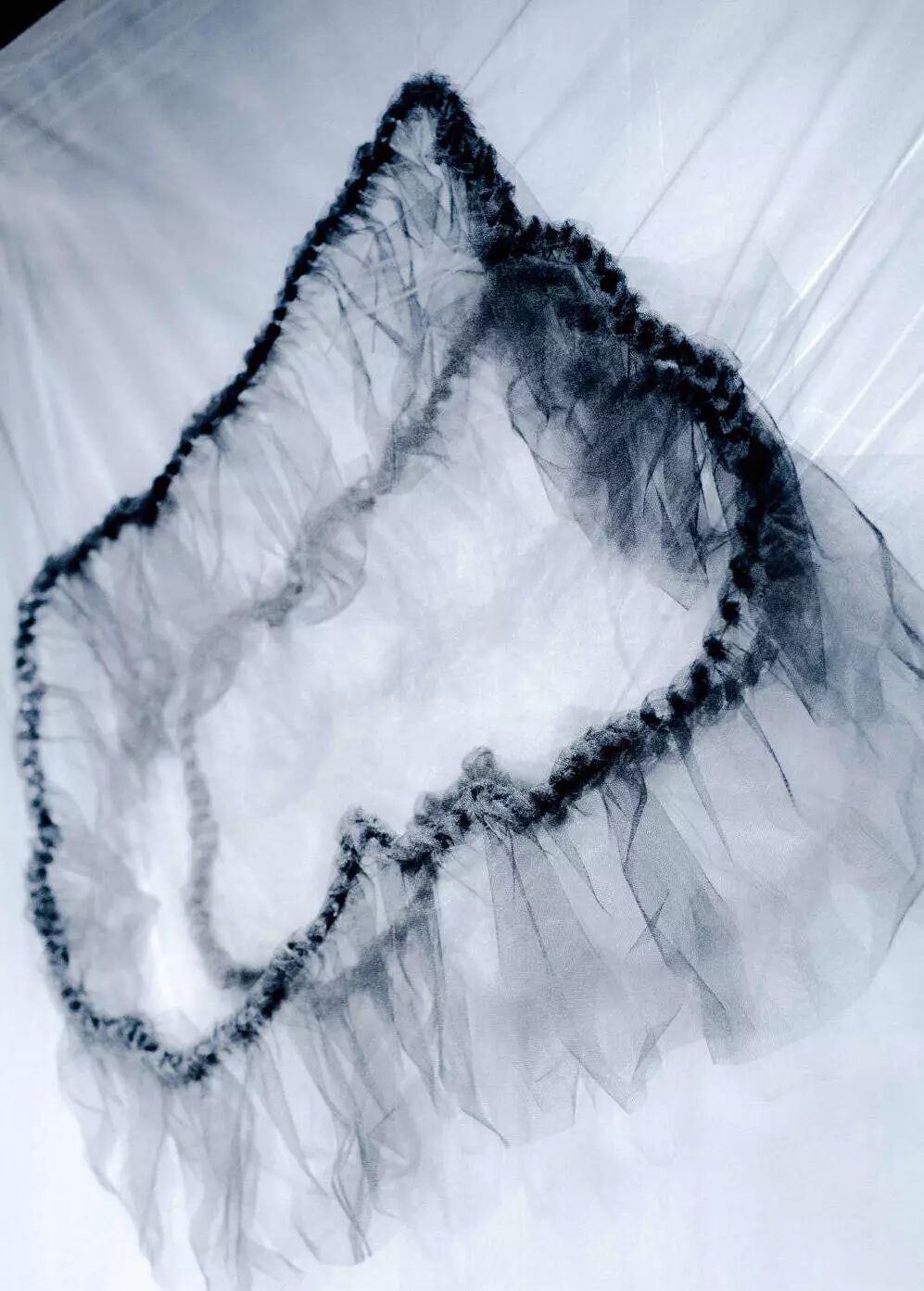 此外,设计师还将抽象化的肌肉骨骼元素结合X射线的医学主题,尽数穿插于别具一格的面料再造中。浪漫华美的荷叶边、通透可爱的柔美纱裙一向是设计师的独门绝技。