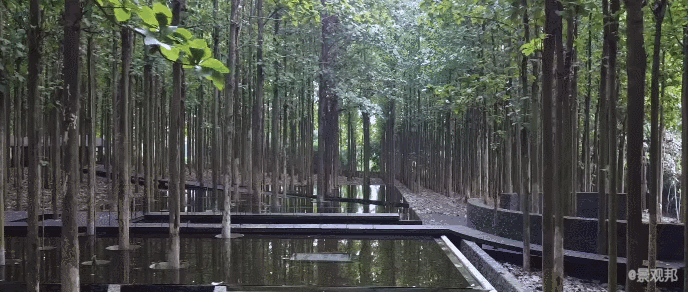 下沉步道以林间中心水景底部空间截至,台阶两侧精心设计的跌水让人在潺潺流水声中前行,心境愈发沉静。