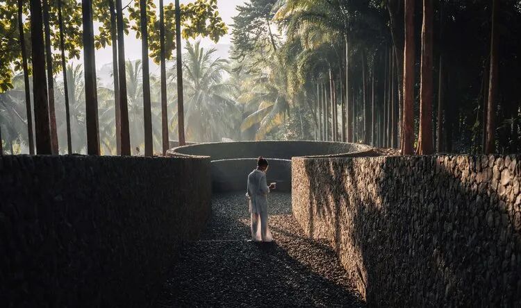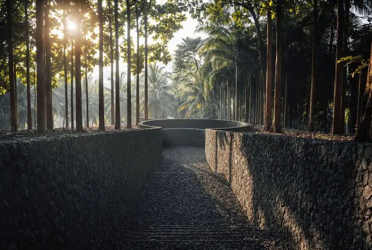 在到达柚树林的边界处,是一个圆形的下沉转场空间,界定空间的同时让访客的体验更加深刻。清晨,阳光穿过树林,拨开裹挟晨露的浓雾细碎地洒在落叶上,林间的丁达尔效应让这里平添了几分神圣感。