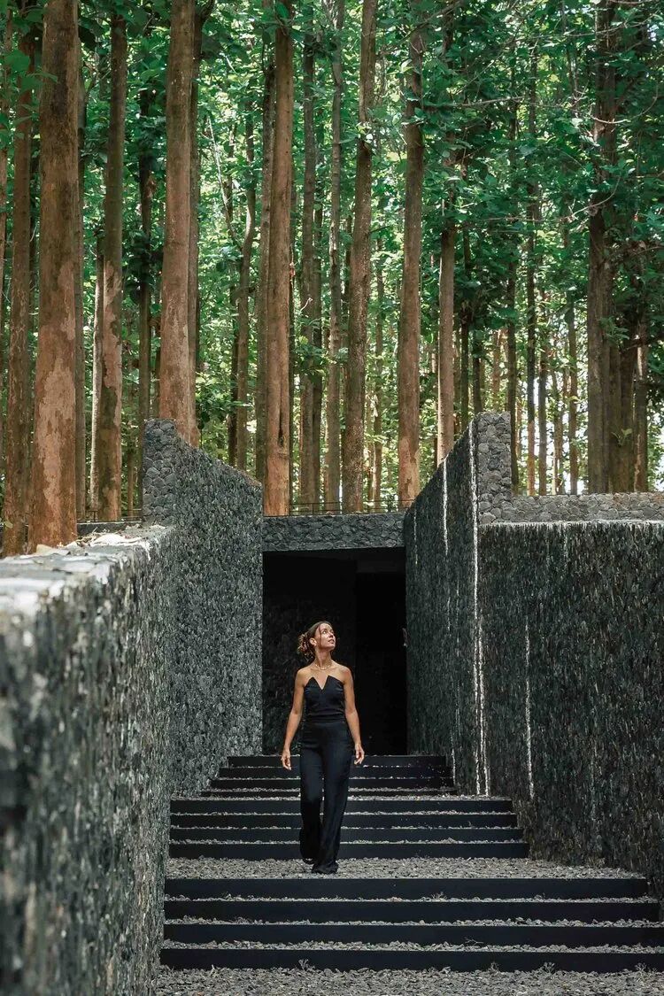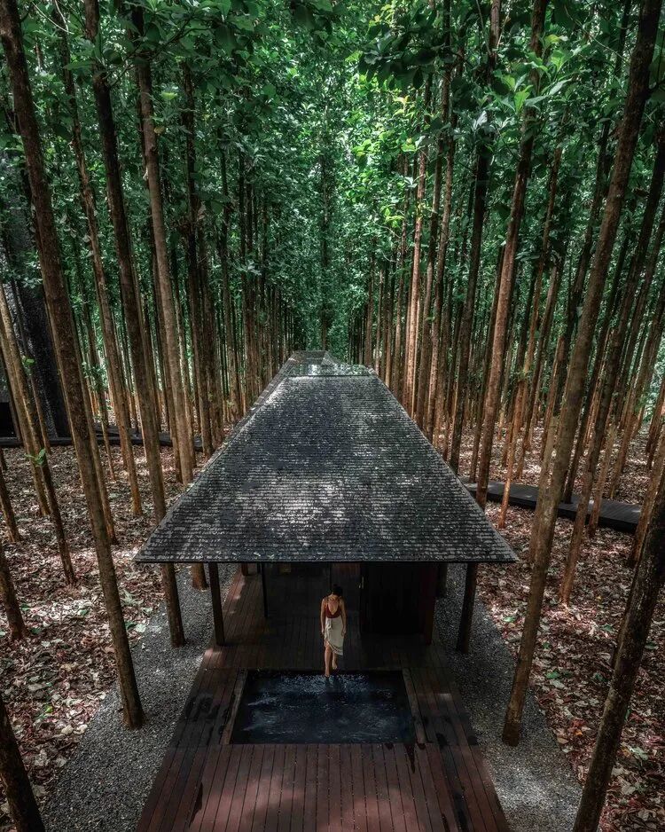 而别墅就藏在不远处的柚木林内,由于树干的遮挡,依稀可见的建筑轮廓与森林毫无违和感,这也是设计师想要表达的,即从喧闹慢慢步入静谧的感受。