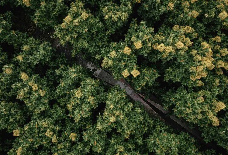 距别墅不远、木甲板临近终点处,是同样以石材砌就的狭高的观景塔,人们除了在低视角感受柚树林阵列的仪式之美,也可以在观景塔上俯瞰树林。
