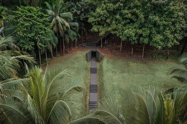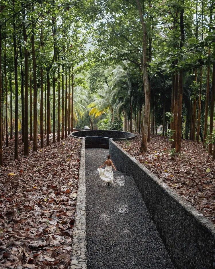 这段下凹的步行道本是农用车道,设计师有意用步道替代车行道,他想让造访此地的每个人都能够体验步行穿过柚木林所带来的那种幽深而宁静的感受;同时他也不希望车行的嘈杂破坏这片密林的静谧。