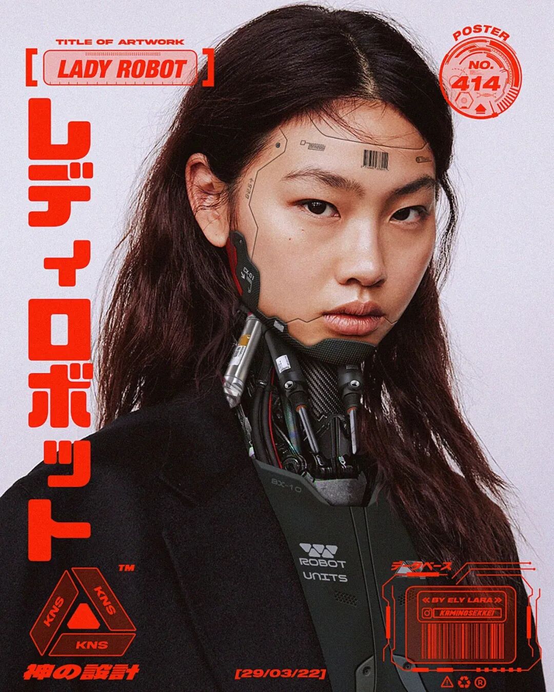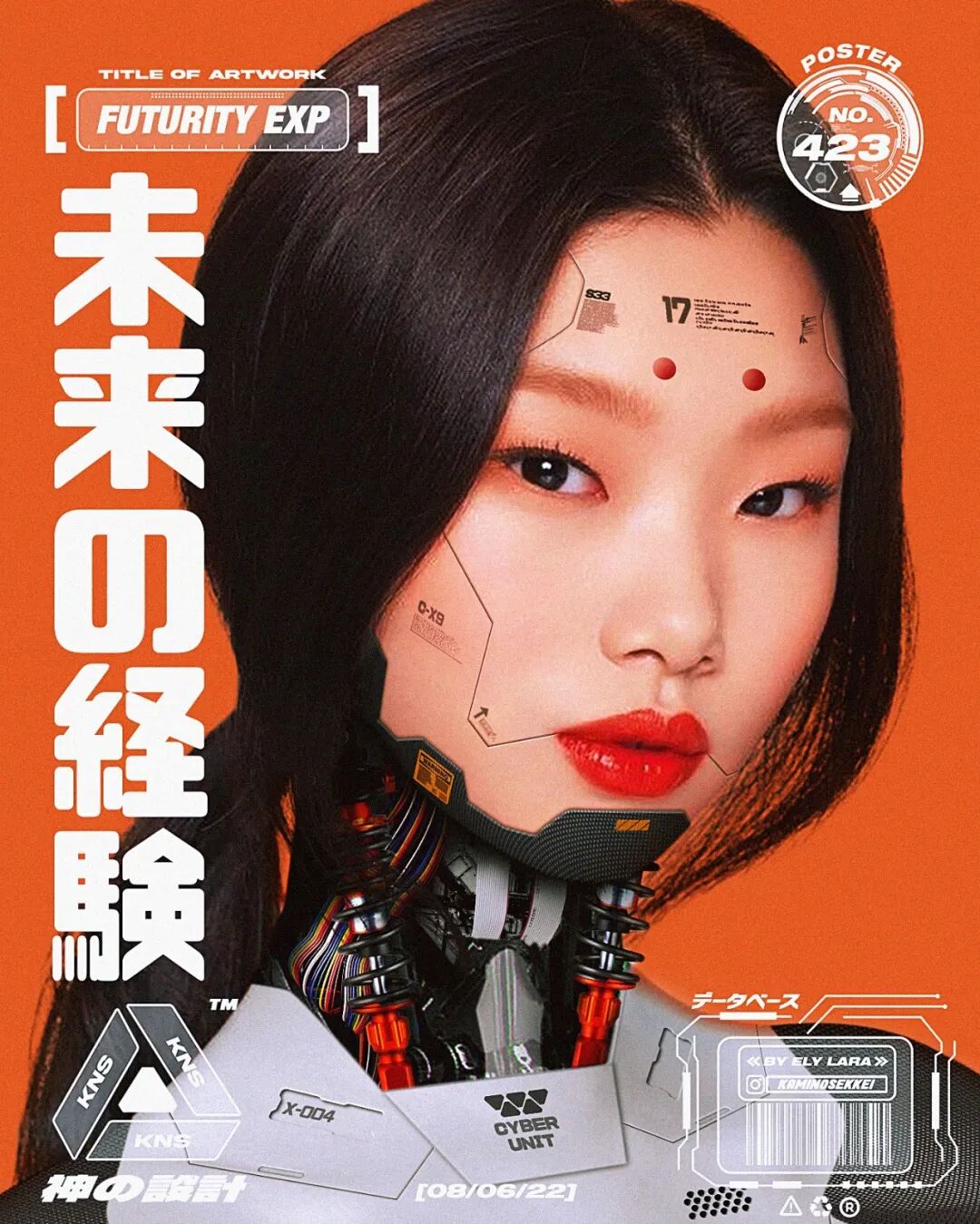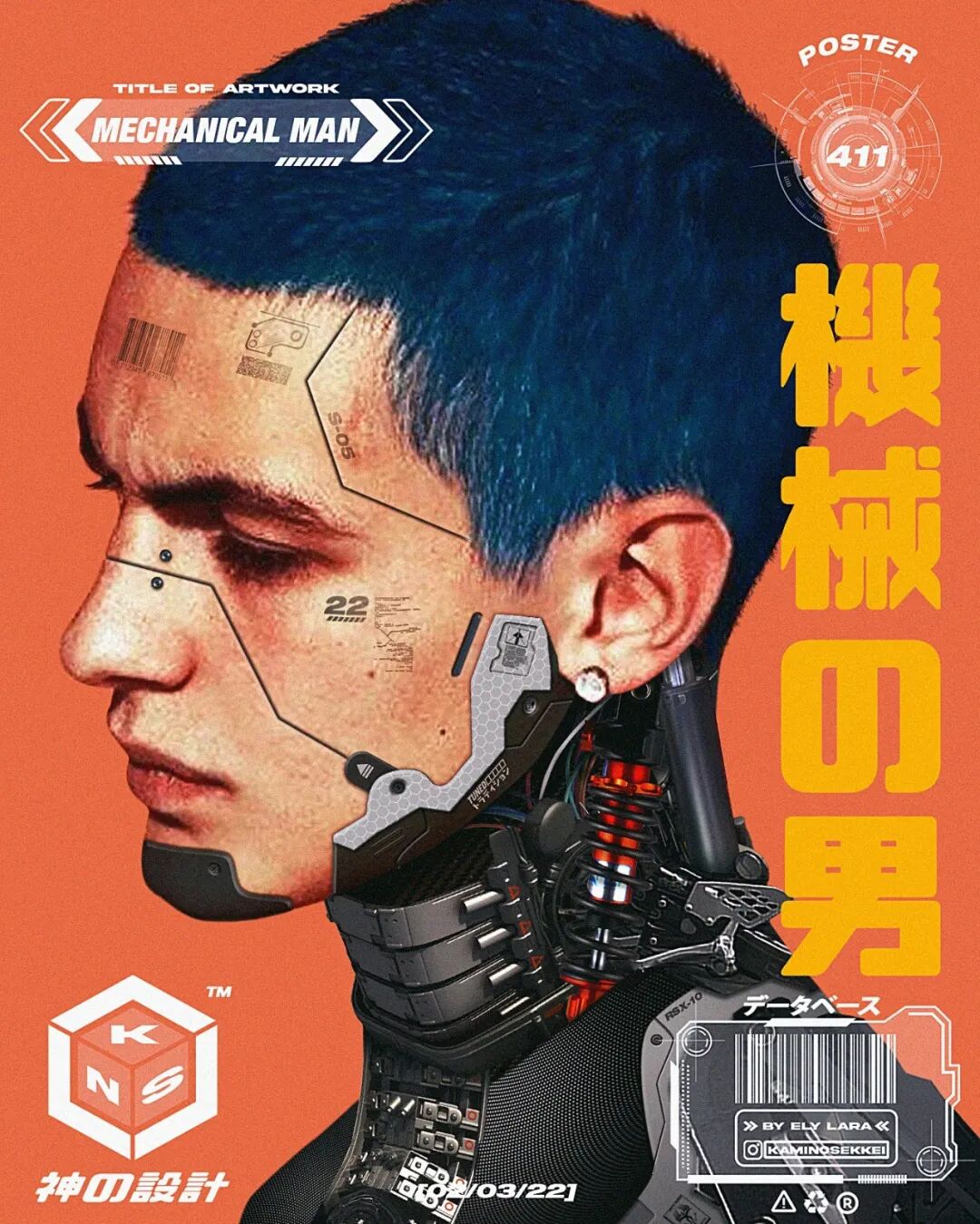 利用网络上摄影作品或者自拍经过二次加工,将人物素材进行特殊处理,结合机械化的科幻元素,一些数字穿戴设备,打造半人半机器的「赛博格」,再搭配线性图表字符进行排版, 复古科幻风格的字体设计,高对比度、高饱和度、低亮度的画面,最后的作品有种壳机动队即视感!