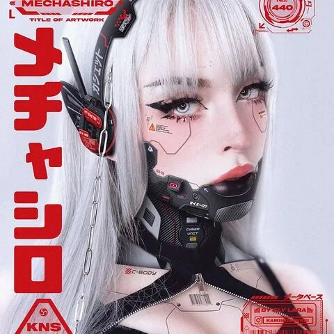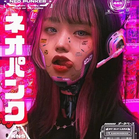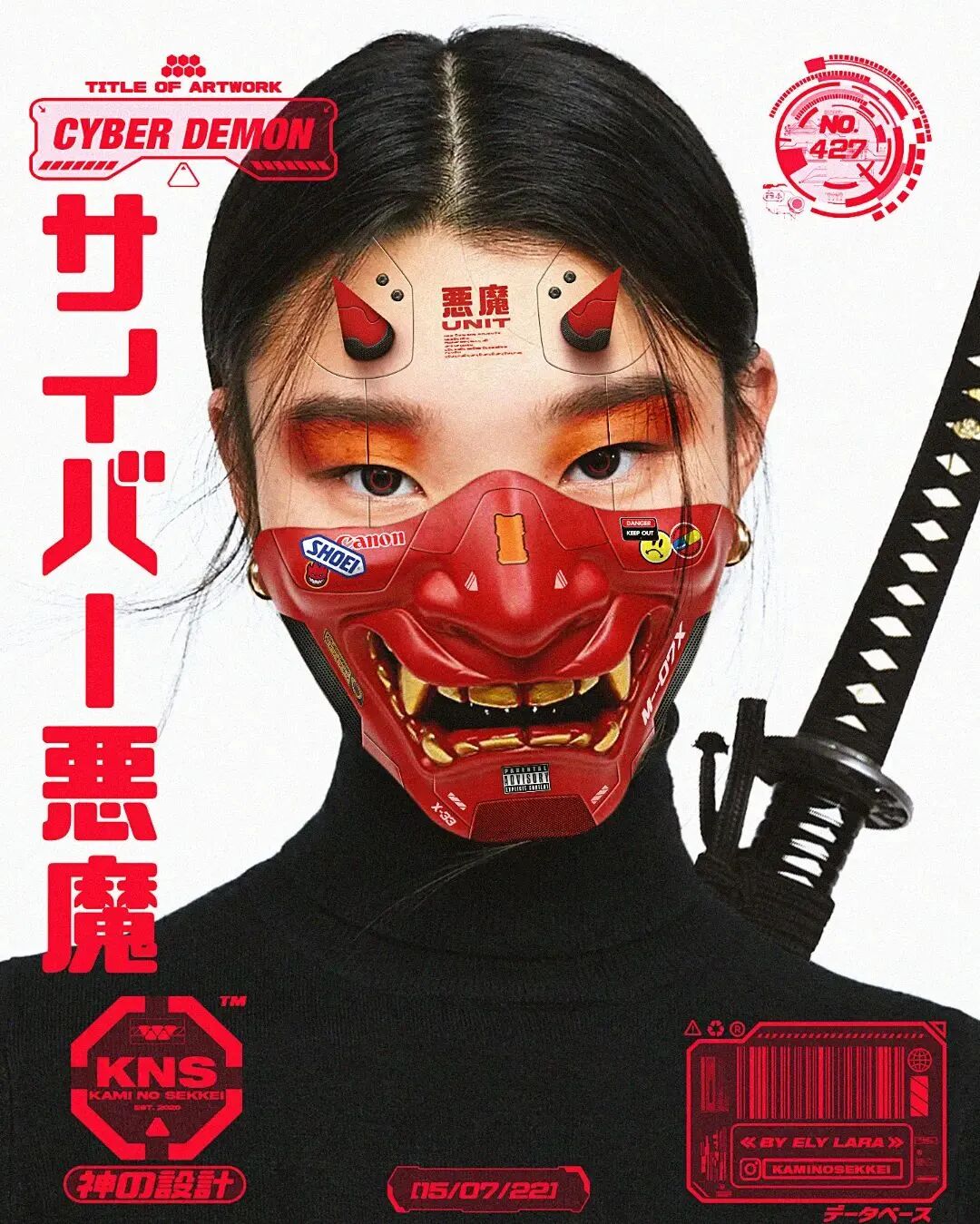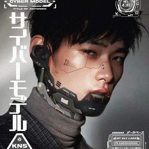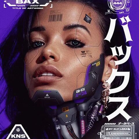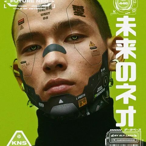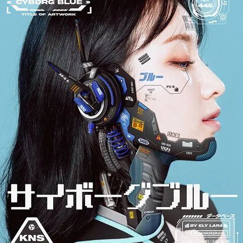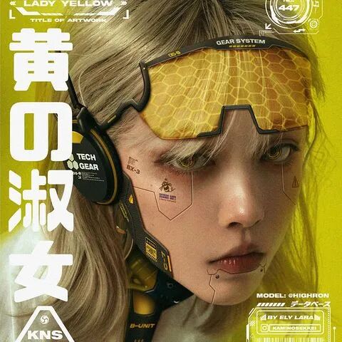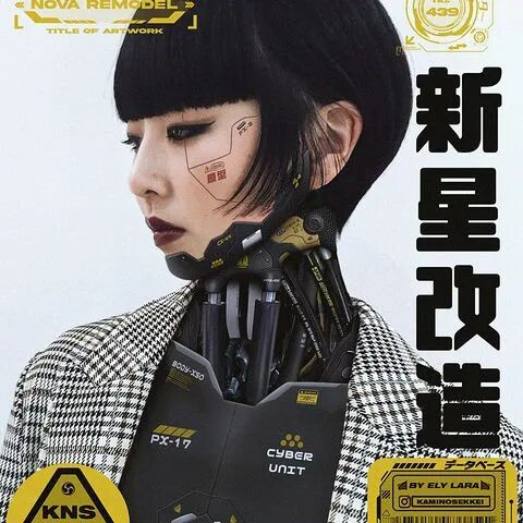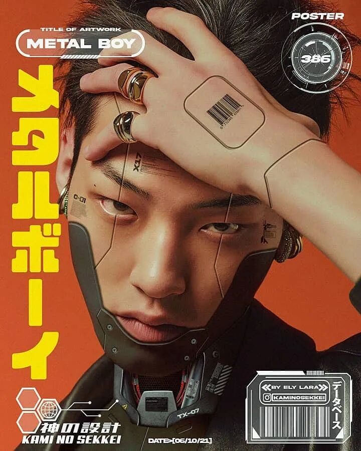 利用网络上摄影作品或者自拍经过二次加工,将人物素材进行特殊处理,结合机械化的科幻元素,一些数字穿戴设备,打造半人半机器的「赛博格」,再搭配线性图表字符进行排版, 复古科幻风格的字体设计,高对比度、高饱和度、低亮度的画面,最后的作品有种壳机动队即视感!