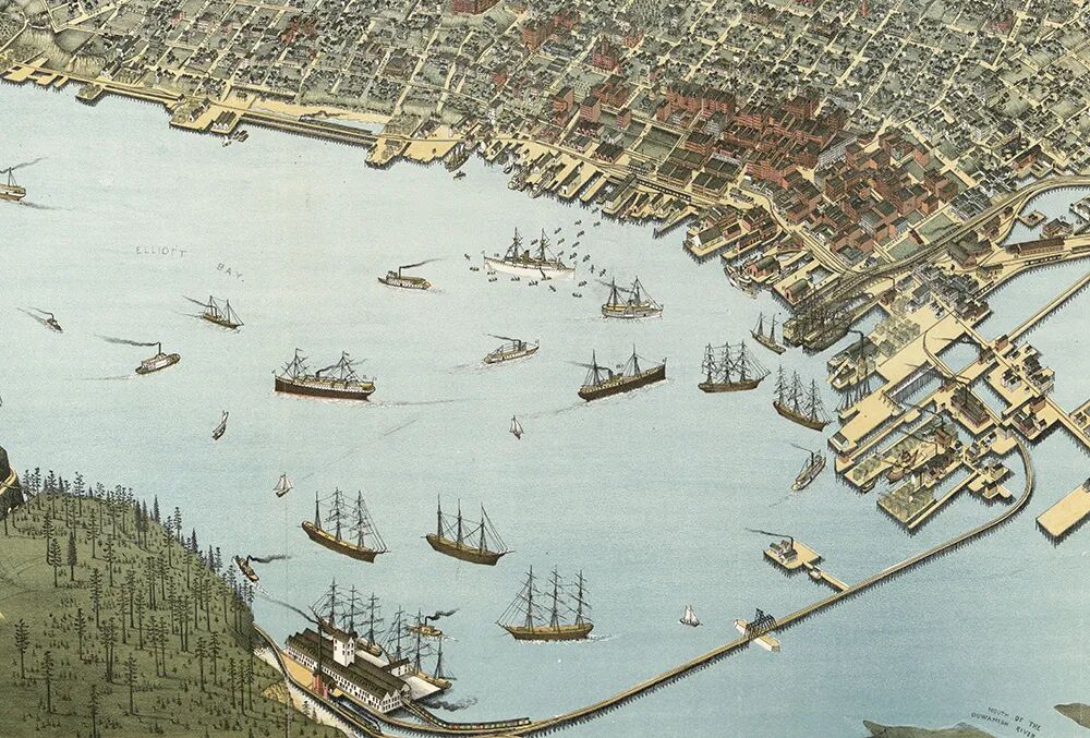 ▼ 19世纪末,繁荣的的西雅图港口区(来源:Wikipedia)