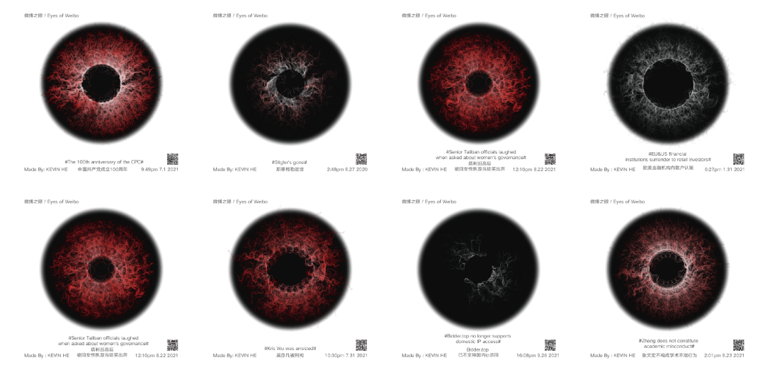 《微博之眼》将微博评论数据可视化并以脉络串联。情绪、态度、群像、冲突,都将在这个由数据生成的瞳仁之中被任何人洞视。当碎片化的信息以“瞳仁大观”的形式呈现,我们能否探究到隐匿其中未被众人察觉的信息?通过微博之眼“与文字对话,与数字对视”。