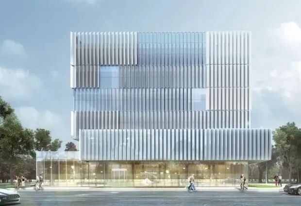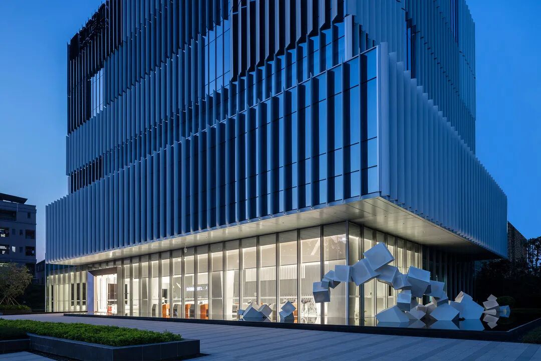 通过错动、咬合的设计手法完成建筑立面的基本形态,化解了建筑体量的沉重感。材质上采用银灰色铝板和中空玻璃,营造科技感十足的效果。