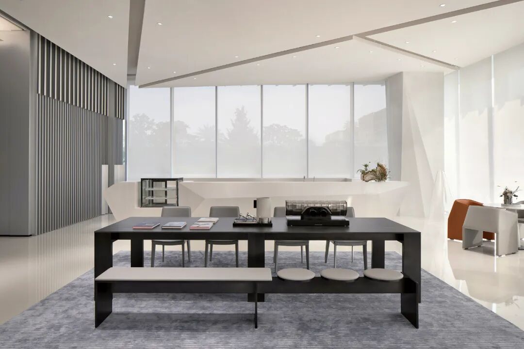 前台背景墙延续建筑外立面造型,天花的折线设计加强空间的纵深感。软装家具以黑白灰色调为主,局部穿插橙色单椅,为空间中增添一份温度。