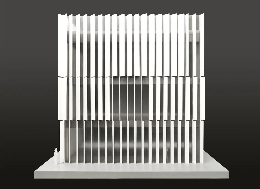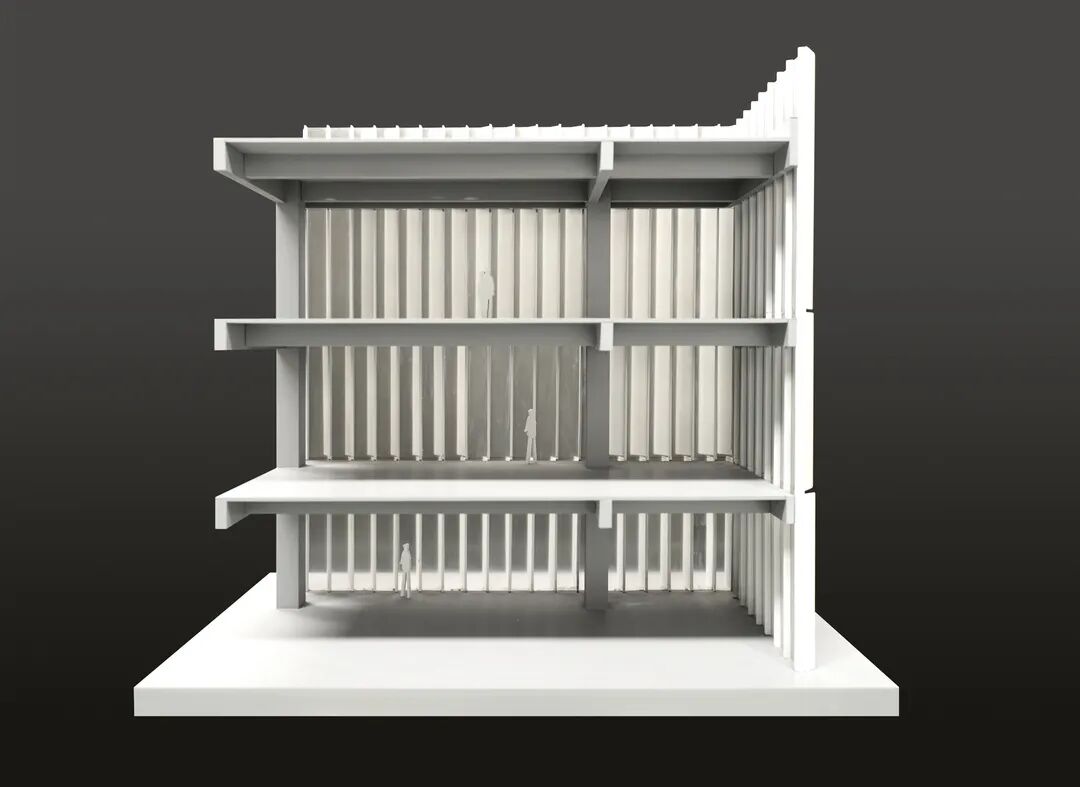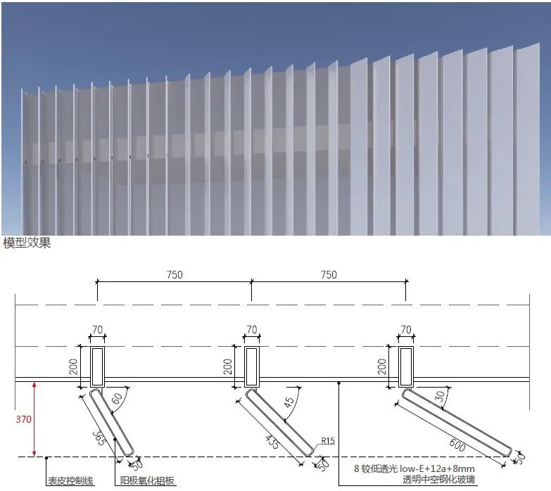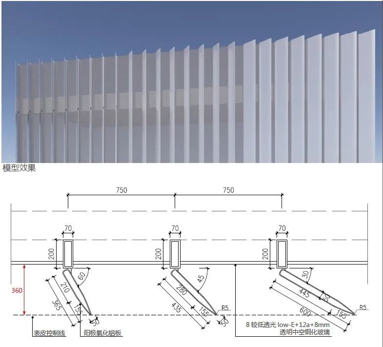 在建筑确定的形态关系下,对外表皮铝板材质的形状、尺度、角度等细节进行多次推敲,经过与幕墙专业单位的多轮可行性探讨,深化模块做法及连接关系,对实物样板效果精益求精。