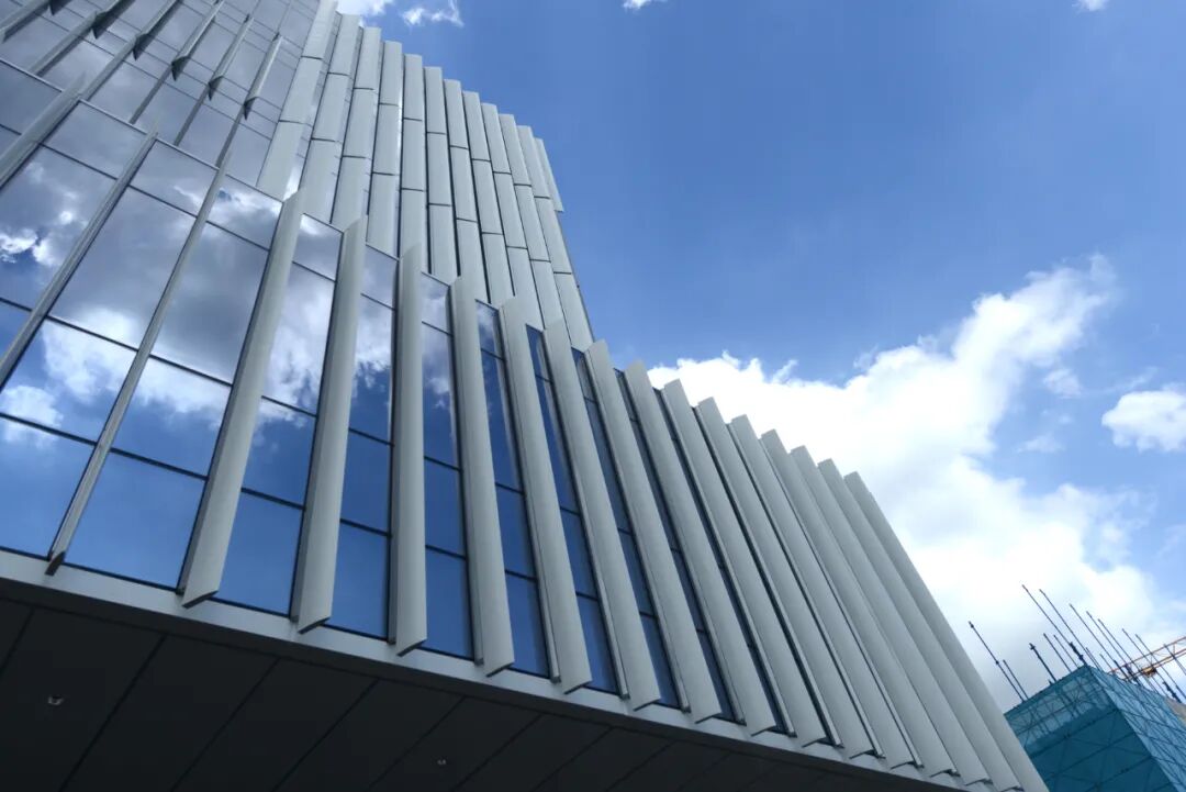 银灰色铝板通过不同的斜面角度增加立面层次,形成一种渐变,同时具有遮阳、节能、环保的作用。