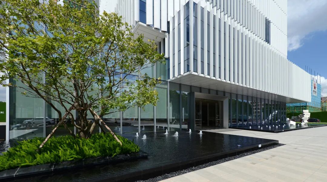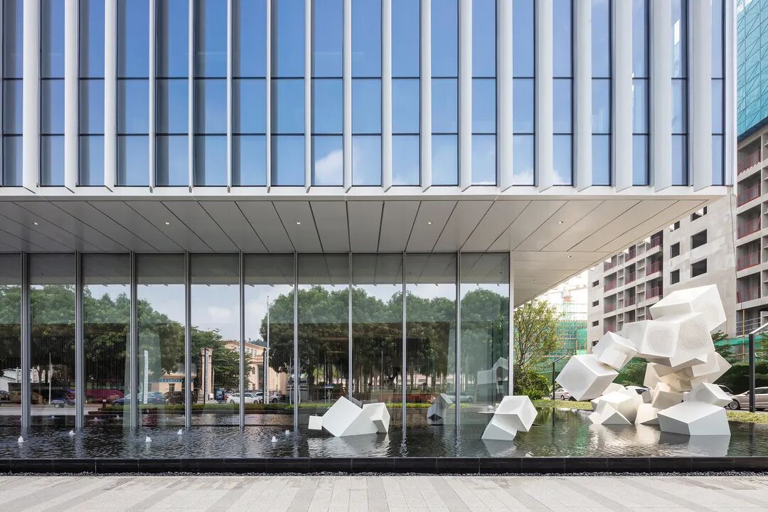 主入口门框沿用铝板斜面造型,同时巧妙划分了两侧的水景,白色的堆叠艺术装置与建筑形态产生呼应,水面波光粼粼与建筑表皮韵律完美契合,涌泉声音的注入让建筑空间变得生动起来。