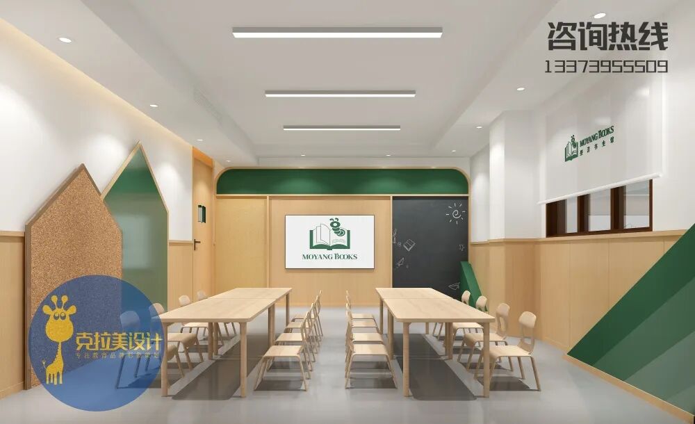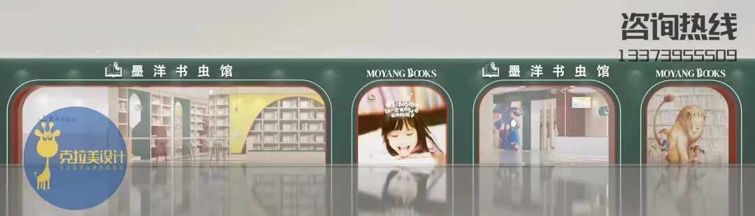 门头设计遵循墨洋书虫馆的教学理念,将书籍与主题墨绿色的设计感融入环境中,准确传达品牌名称及教学内容。大面积玻璃门的使用,最大化地引入光线,将内部环境与外部环境产生有机的联系,践行生态环保的设计理念。