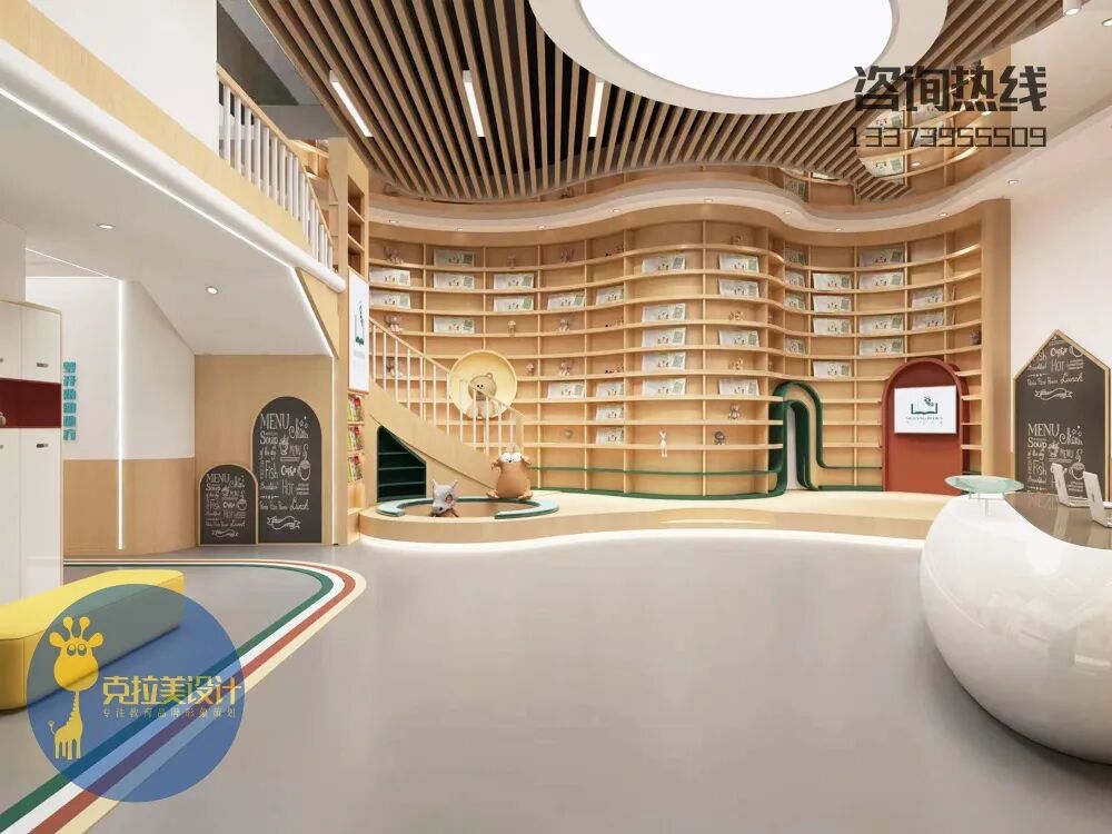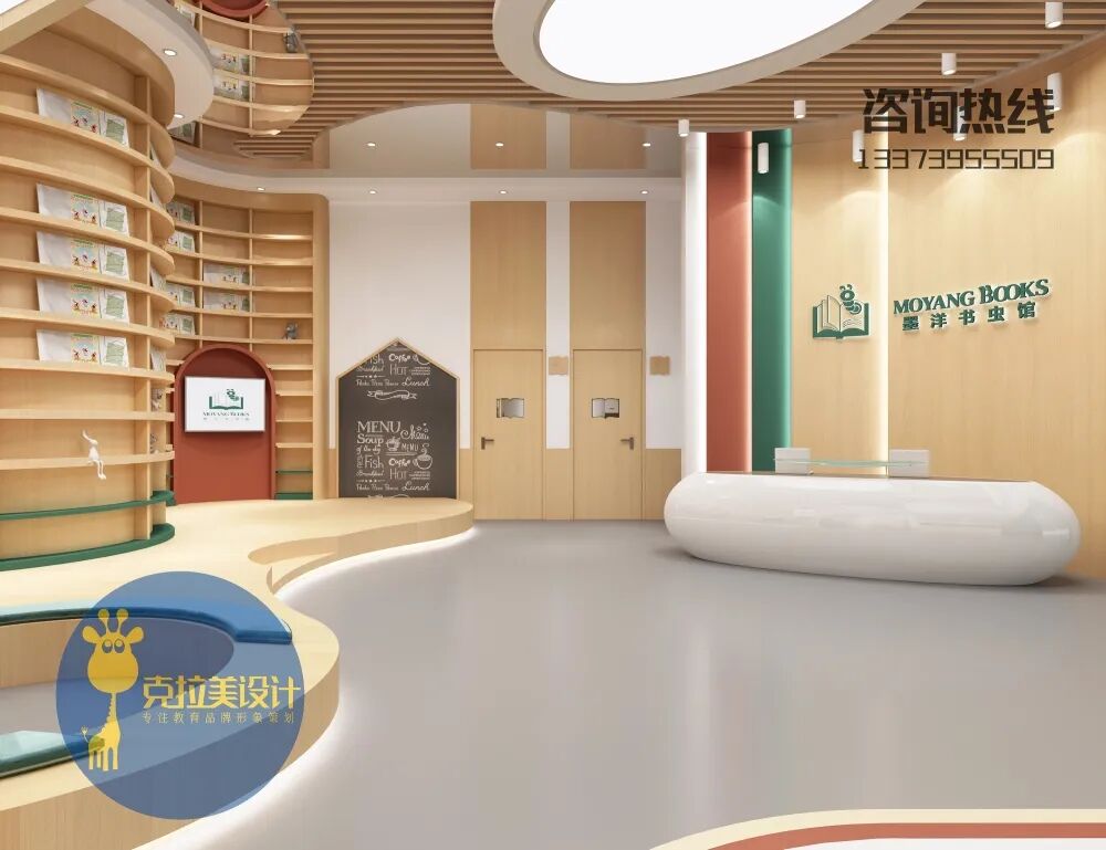 设计是恒久的,经过设计后的空间,经得起时间的观感质感。墨洋书虫馆整个大厅以弧形作为设计元素,圆润的前台,天花板和直通到顶的书馆都贯穿设计理念,将强烈的趣味感和书香气融入整个环境,突出品牌形象,让家长感受到这里良好的氛围。