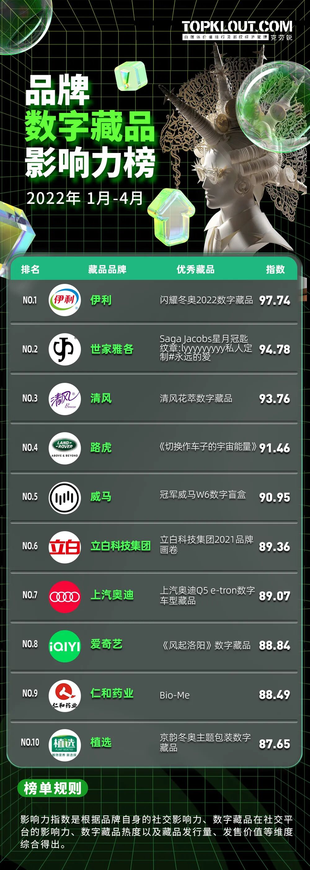 榜单从数字藏品的社交影响力、品牌社交影响力、数字藏品稀有度、数字藏品总价值、发布平台影响力五大维度出发,评价的对象是消费品牌以市场营销活动或元宇宙营销发布的数字藏品,暂不包含艺术机构、博物馆等发布的艺术类数字藏品。