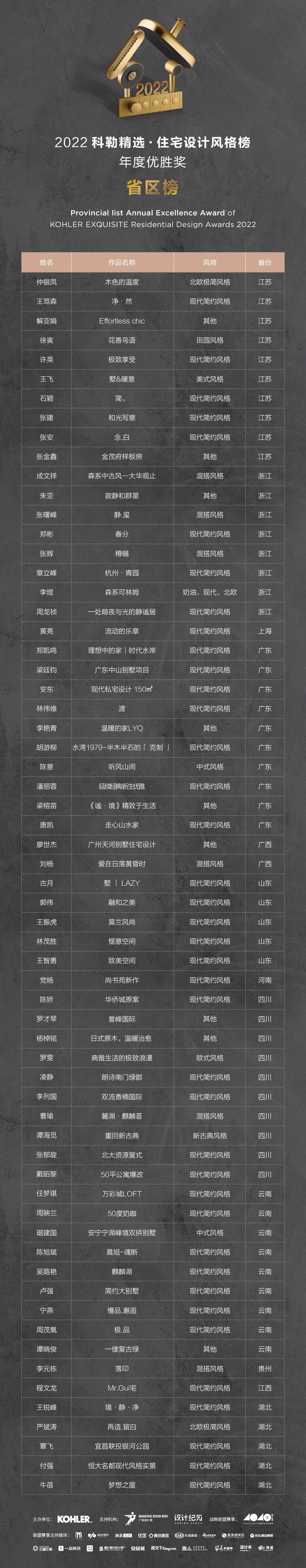 科勒精选·住宅设计风格榜由科勒中国于2019年发起,致力于成为优秀室内设计师提供设计作品展示和交流平台,传播敢创设计与艺术之美。2022年,是科勒精选·住宅设计风格榜实施的第四年,联合广州设计周及设计纪元进一步升级带来全新“面貌”, 以一个赛事为载体,推动赛制、渠道、推广三面升级,首度增设省区榜。采用线上初赛-线上复赛-年度盛典不同阶段节点赛制的形式。2022风格榜大赛启动以来共收到参赛作品1531套,参与设计师人数971位,覆盖范围达30个省区129个城市,感谢所有设计师伙伴的热情参与!
