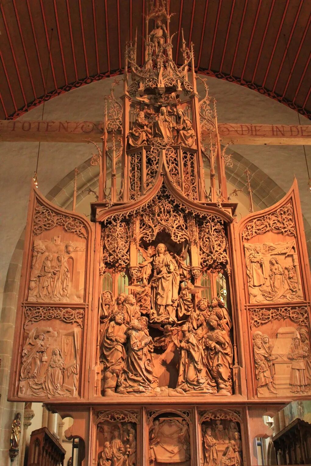 大家好!今天给大家介绍保存在德国克雷格林根教堂内的圣母祭坛木雕,由德意志优秀雕塑家蒂尔曼·里门施奈德创作。