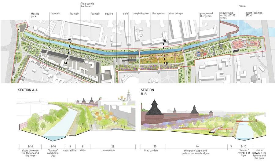 The long embankment cannot exist separately to the rest of the city: the walking route along the former river-bed of the Upa river becomes a part of the new system of pedestrian areas with several semantic centres - a museum quarter, a pedestrian street with shops and cafes and also the Kremlin territory which is becoming more accessible due to a new entrance.