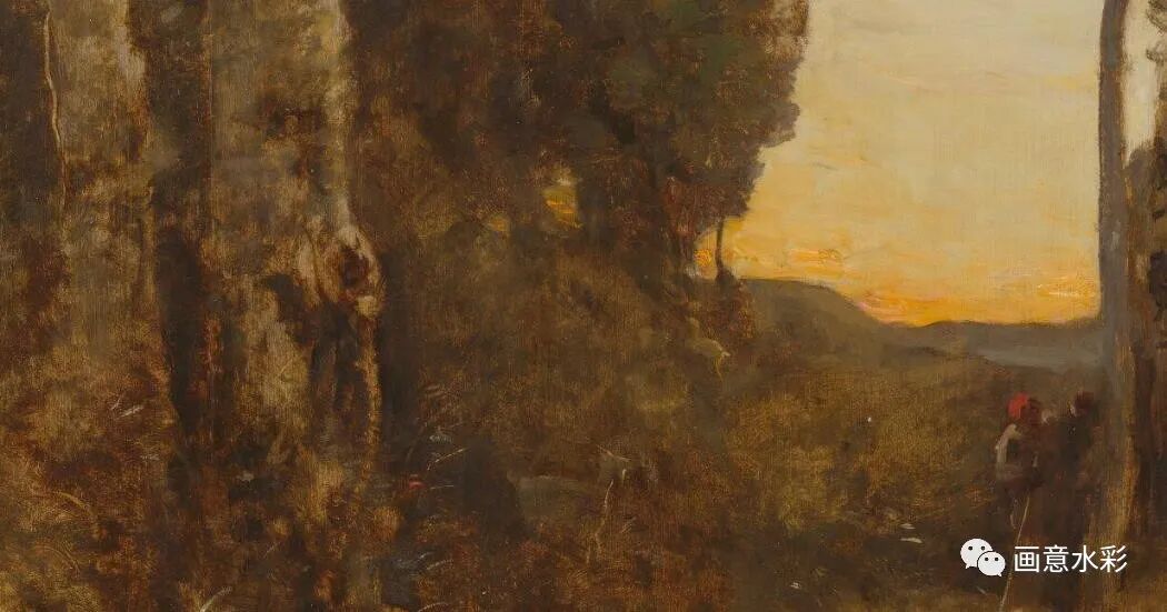 从可以在整个画面中看到的薄而粗略地应用的棕色底色开始,柯罗用更厚、更不透明的颜色来构建构图,特别是在岩石和更茂密的树叶上。然而,大部分图片仍然是几乎单色的棕绿色。最强烈的颜色是地平线上的镉黄橙色带。混合淡淡的玫瑰粉色,预示着黎明破晓时太阳即将升起。这些黄色条纹涂有厚厚的厚涂颜料,几乎是面板上唯一的亮色区域。