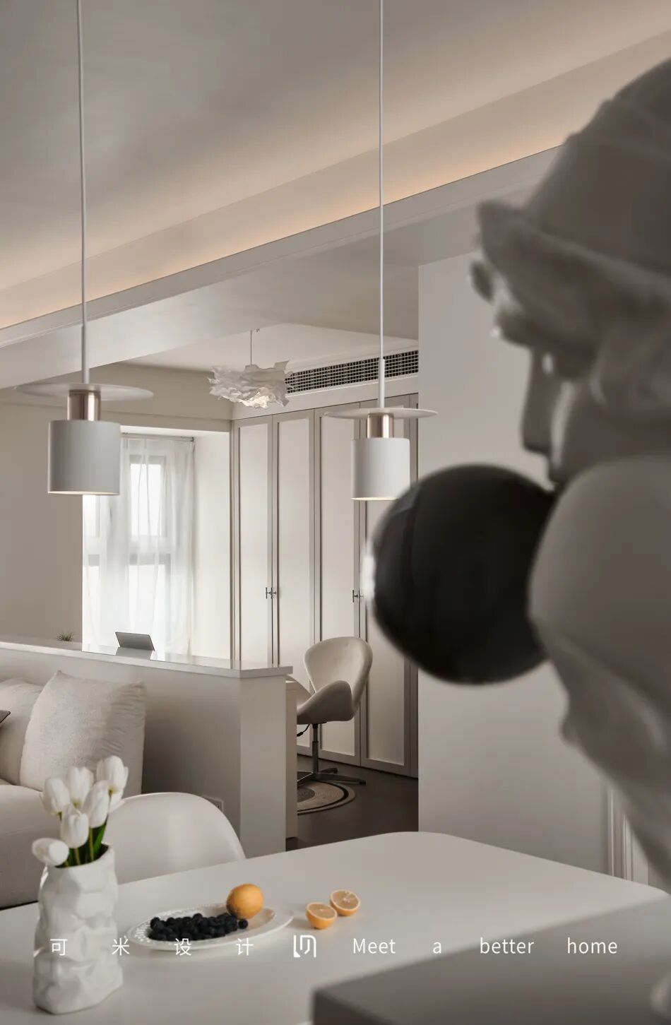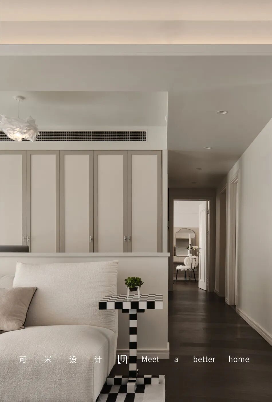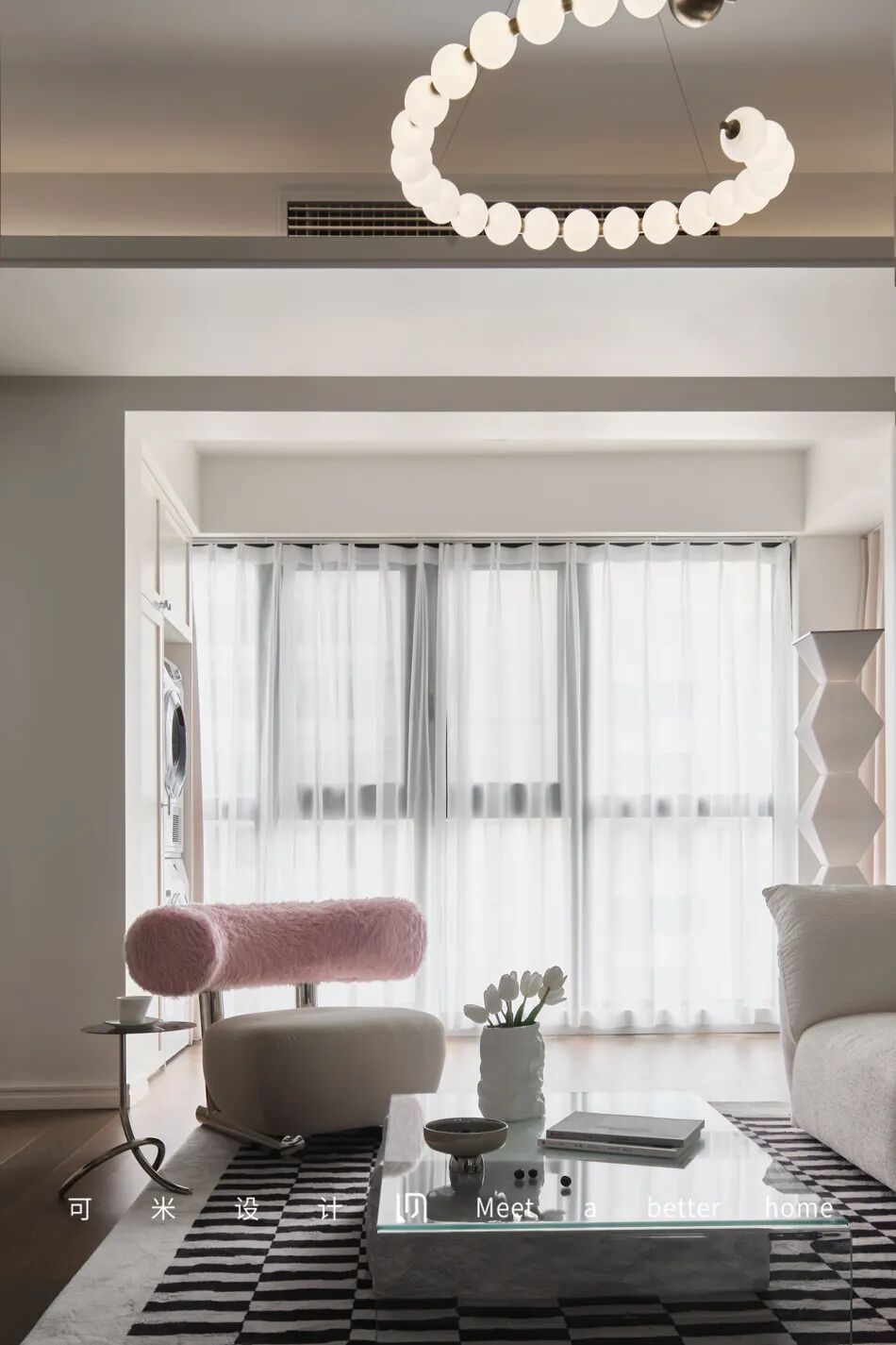 客厅空间以温润的奶白色为主色调,将现代风格与法式元素相融合,打造出温柔治愈又有高级感的家居空间。