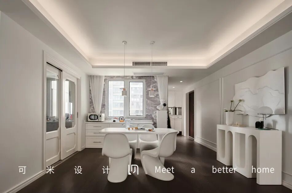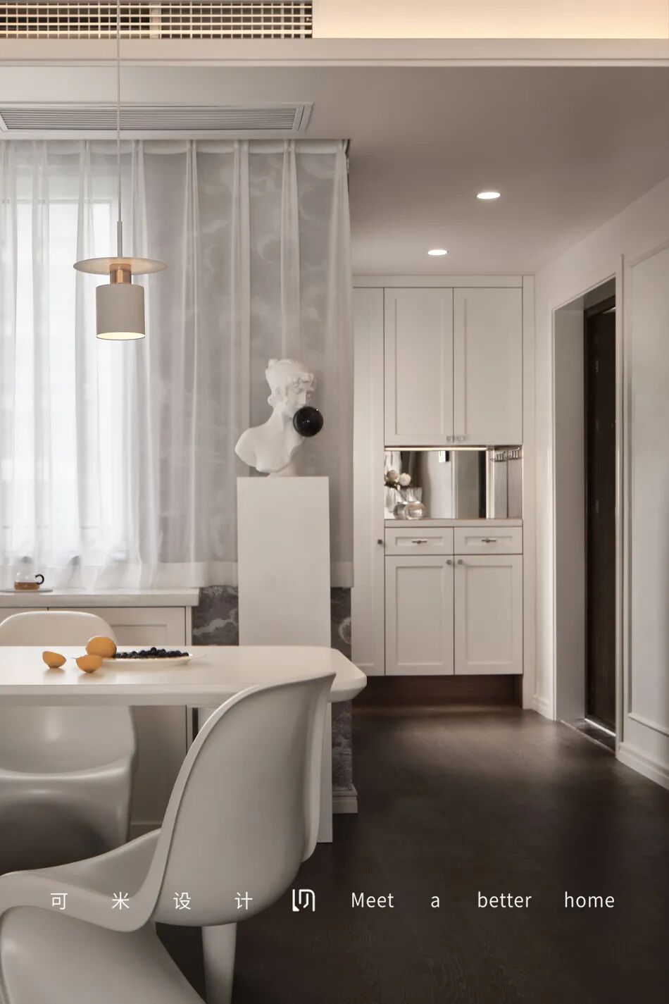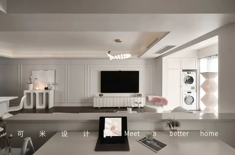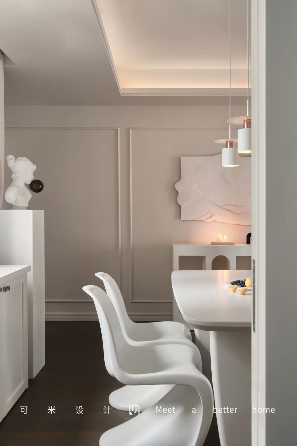 客厅空间以温润的奶白色为主色调,将现代风格与法式元素相融合,打造出温柔治愈又有高级感的家居空间。