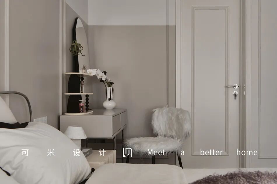 卧室内延续公共区的石膏线装饰,整体看起来非常精致优雅;墙面撞色与石膏线的延伸,卧室门也加入了线条装饰,透露着目之所及的轻法式精致。