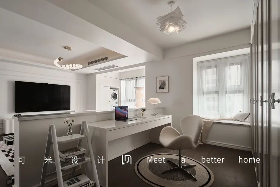 打通书房与客厅,原本两个空间的隔墙拆成半墙,原书房与走廊的墙体拆除,实现客厅书房一体化。