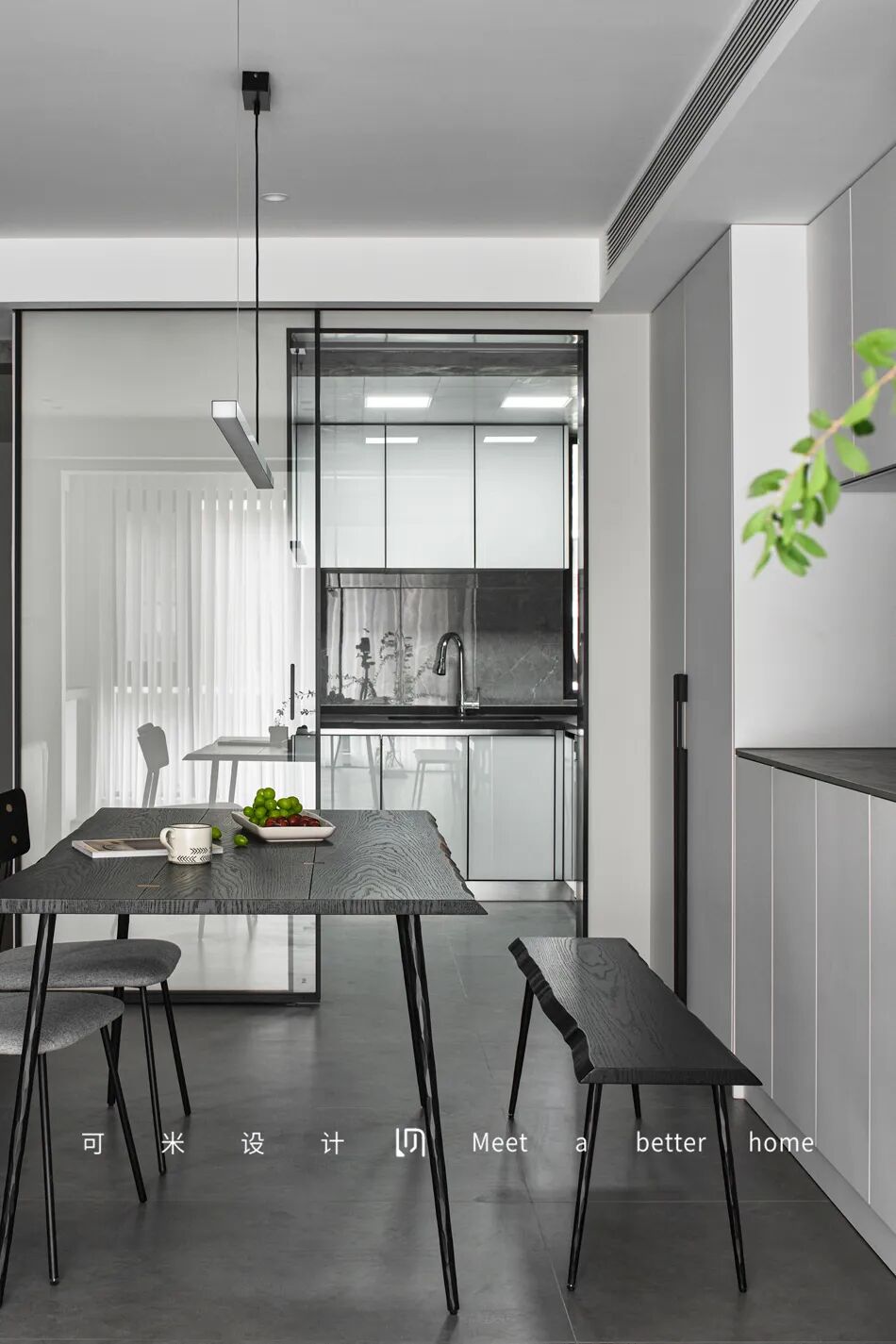 进入屋内,一种归家的宁静和安逸扑面而来,满是令人放松的气息。客餐厅一体化的设计,将空间的轴线贯通,开阔式的空间布局纳入更多的自然光线,令空间通透而明亮,减少压抑感和拥挤感。空间上以现代简约为设计手法,灰白色调为主,通过精致悦目的细节,使空间结构明确、外观明快简洁,整体呈现宁静雅致的舒适氛围。