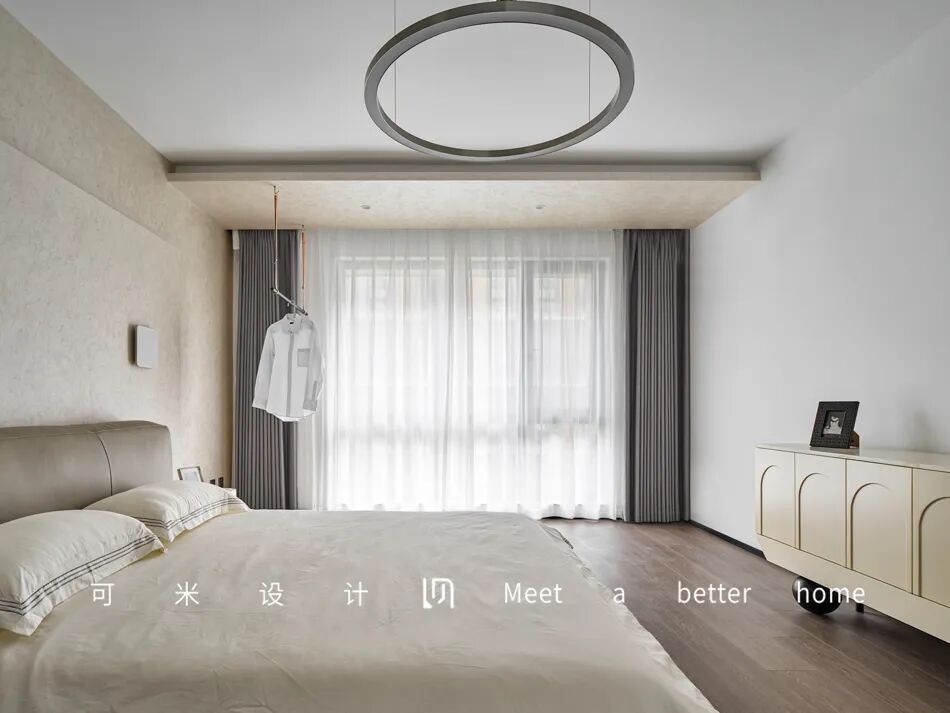 细密的阳光从窗外洒进屋内,清风徐来,纱帘轻拂,明而不透,遮而不挡,带来独特的朦胧美。白色的隐藏式柜体最大限度地保持空间的整洁宽敞,使空间看起来更通透,成为屋内优雅的颜值担当。