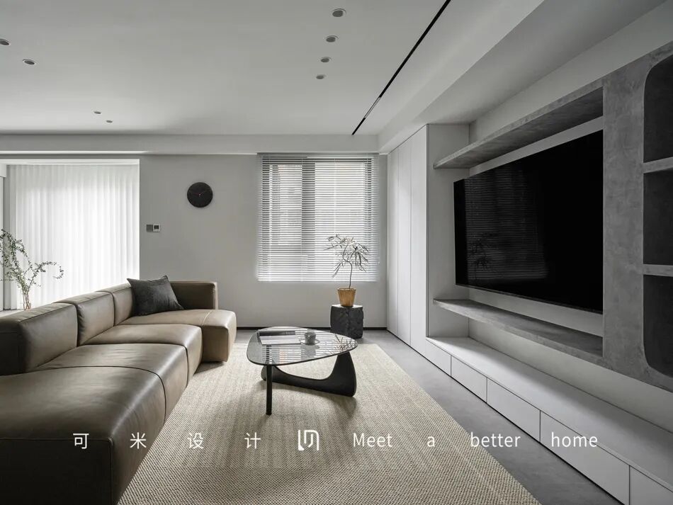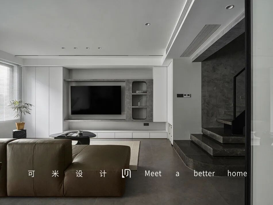 电视背景墙采用隐藏式柜体+展示+电视的组合搭配,让整面墙看起来更整齐划一,用马来漆涂刷打造的开放格,大面积的白色隐形柜体,更具层次感与高级感,给人一种纯净、舒适的感受。