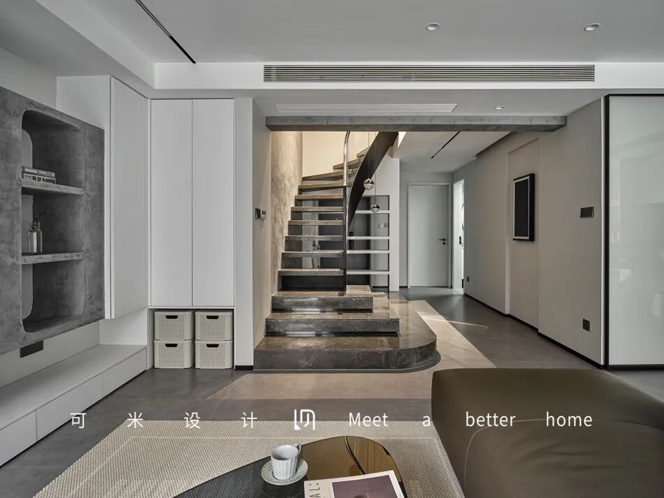 楼梯位置沿着入户的侧墙设置,让客餐厅的布局更加合理舒适,人的视觉和行动都有了缓冲。半旋转式的楼梯,搭配运用石材、玻璃、钢架,线条利落、简约大气。