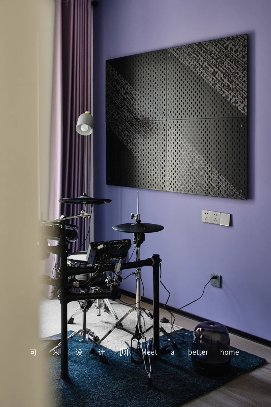 二层朝南的次卧作为娱乐室,架子鼓和舞蹈房设置在同一个空间,其中一面墙涂刷了紫色,赋予空间轻松、浪漫的能量,为屋主提供了一个情趣优雅而又文艺的多功能空间。