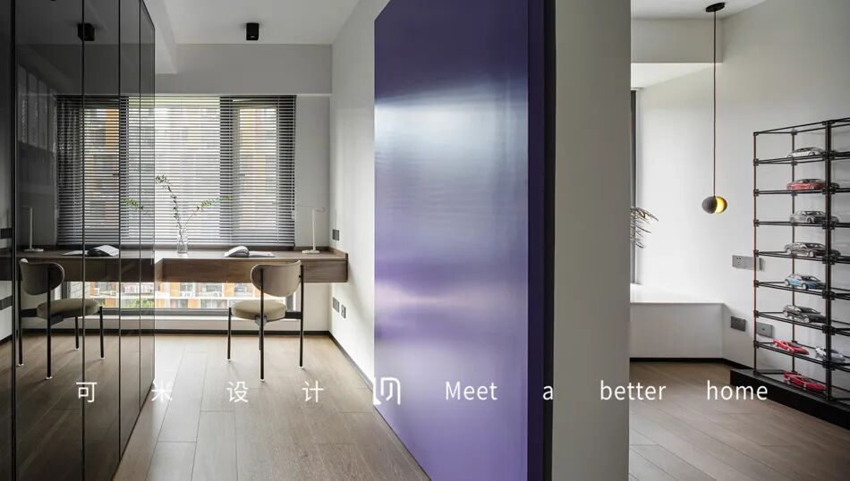 从活动室方可进入书房,打造一间安谧之所,两个空间以紫色的木质推拉门相隔,与娱乐室的紫色背景墙相呼应,在清澈淡雅的空间中增添一份明媚浪漫。沿墙定制一排顶天立地的书柜,采用黑色的玻璃柜门,增加收纳的同时又带来高级感。