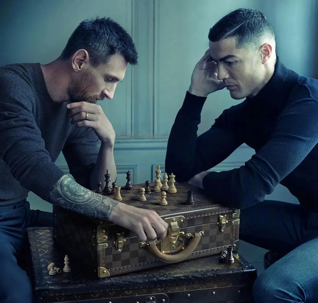 11 月 20 日,2022 卡塔尔世界杯开幕当天,奢侈品品牌「LV」发布球星 C罗和梅西对弈广告大片。图中,C罗和梅西同坐在印满 LV logo 的箱子上比拼国际象棋。